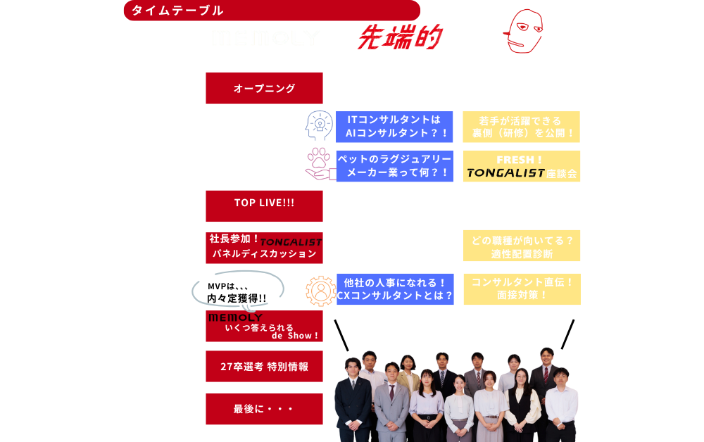 時流に適応し、変幻自在に成長するトップコンサルタントのとんがった発想を体感。様々な業界の最前線で活躍する“トンガリスト”が見ている世界を学生のきみ達にざっくばらんにお答えする「パネルディスカッション」など、驚きのコンテンツが満載!